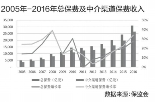截至2017年第三季度,全国共有保险中介集团公司5家,全国性保险代理公司233家,区域性保险代理公司1549家,保险经纪公司483家,保险公估公司366家。全国银行类保险兼代理法人机构1936家,登记营业网点17万余家。2011年到2017年,保险中介渠道贡献保费从1.2万亿上升到2.6万亿。